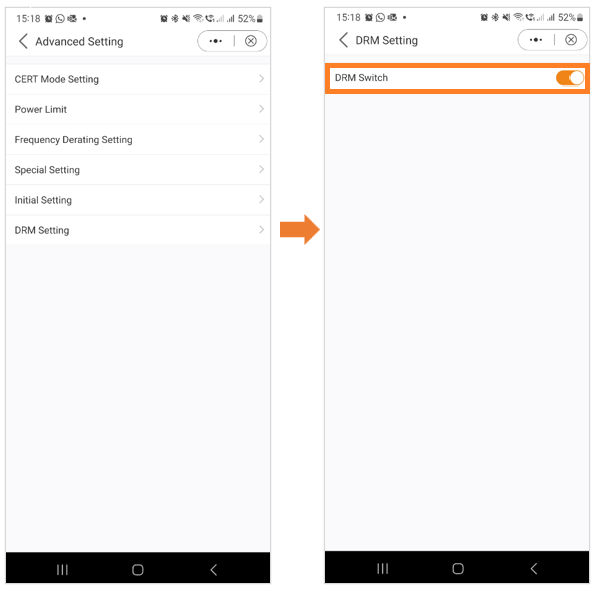 DRM default setting is “OFF”, if DRM set “ON”, but the logic interface un-connected to the switch or the switch is open, the inverter HMI will display “Limit by DRM” and the inverter output power will be limited to zero.