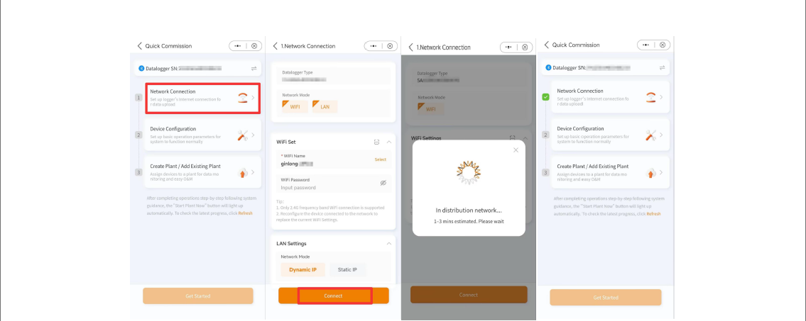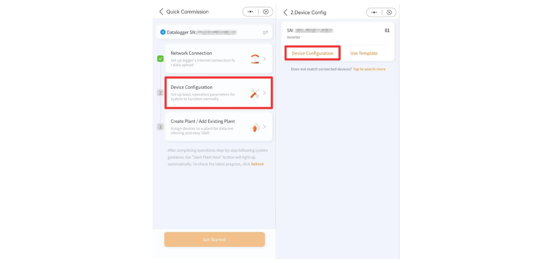 Escanear el código QR del datalogger o seleccionar el datalogger desde la lista Bluetooth para entrar en la página de Quick Commission.