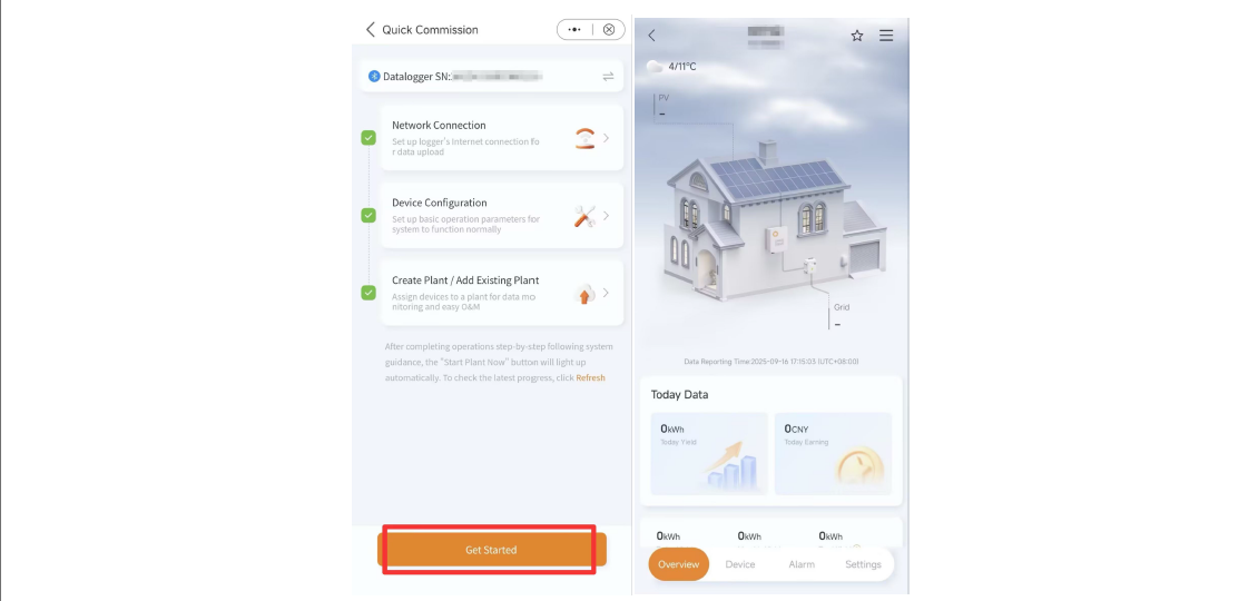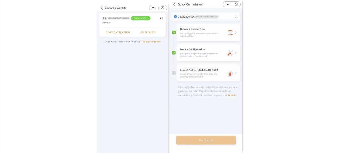 Pulsa Get Started para entrar en la página de la planta y completar la puesta en marcha.