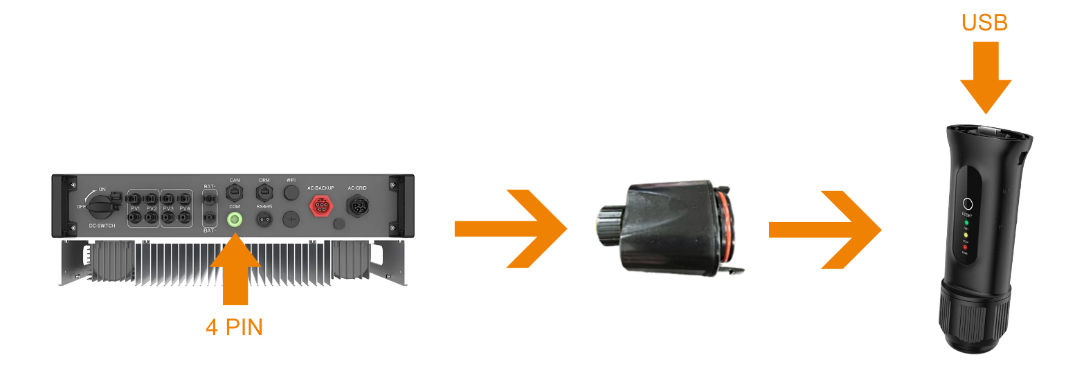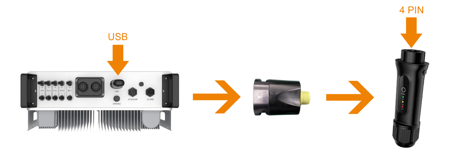 Un invertor din seria RHI 5 G cu un conector cu 4 pini poate fi conectat la orice logger USB folosind acest adaptor.